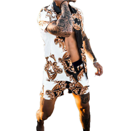 Men’s Summer Shirt Set – Printed Lapel Short Sleeve Top with Matching Shorts