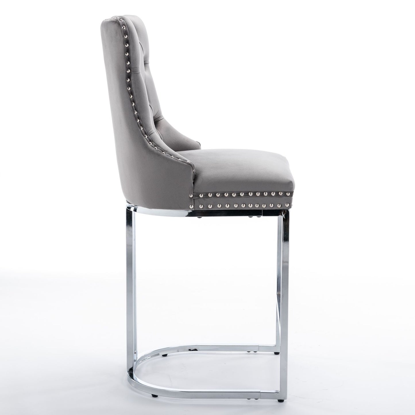 This Velvet Chrome Bar stools featuring a very modern mid-century look, numbers of decorative rivets are inlaid around the cushion and backrest, which looks more noble and elegant. The high back with deep button tufted design gives the whole chair a delicate and luxurious feel.