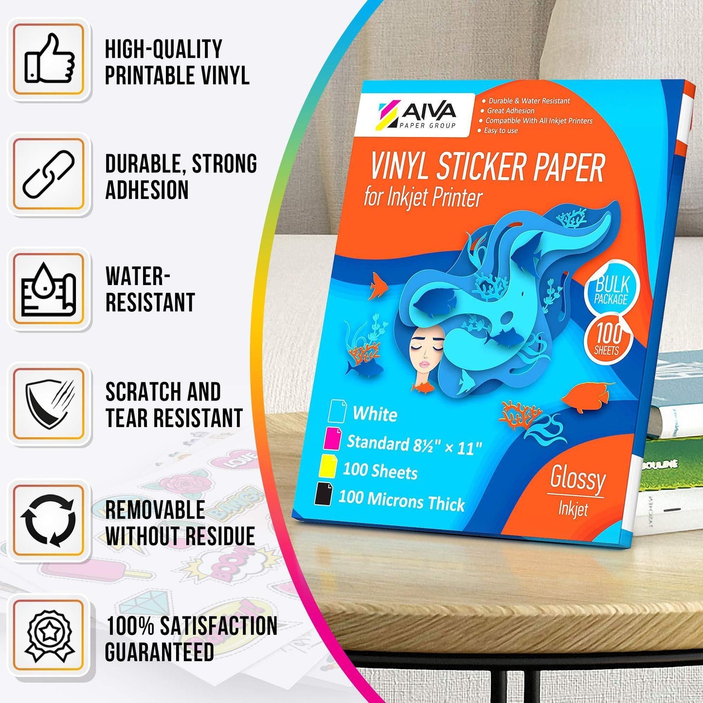 high-quality printable vinyl paper - set includes 100 white vinyl sheets of printable sticker paper for printer, glossy finish. us standard letter size - 8.5"x11". suitable for high resolution and clear image quality